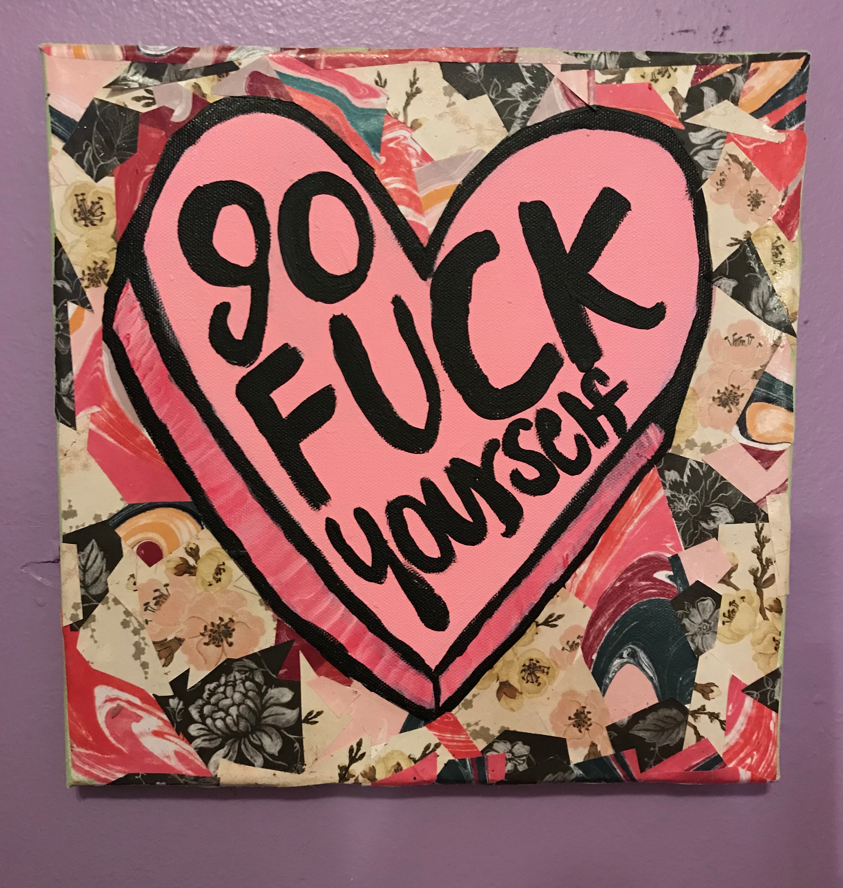 Go Fuck Yourself anti-valentine. Inspired by the trendy heart candies I wanted to paint my own with anti-valentine's sentiments. Surrounded by floral paper, this one has a grungey, vintage look. 12 x 12 canvas. 2019.