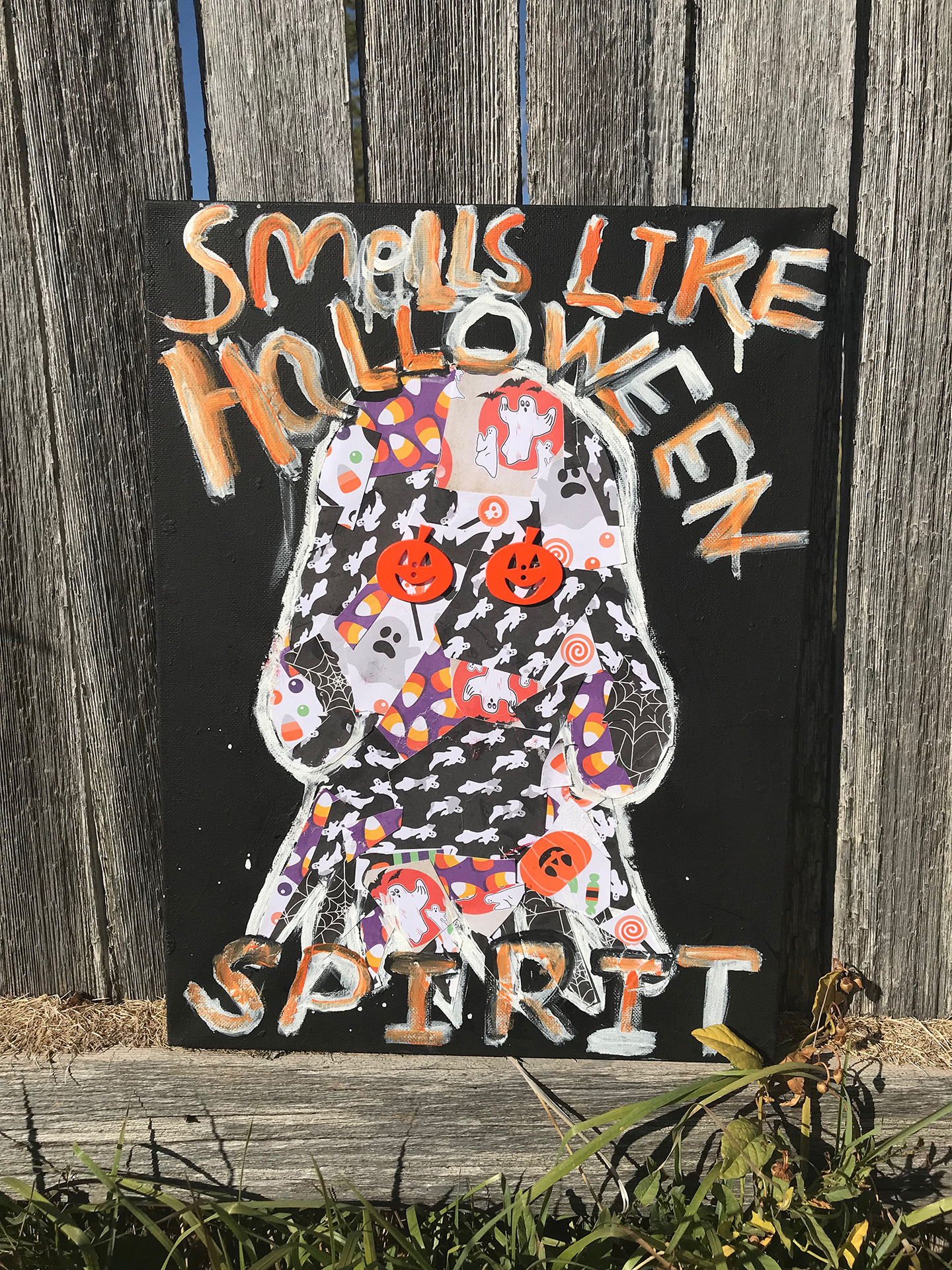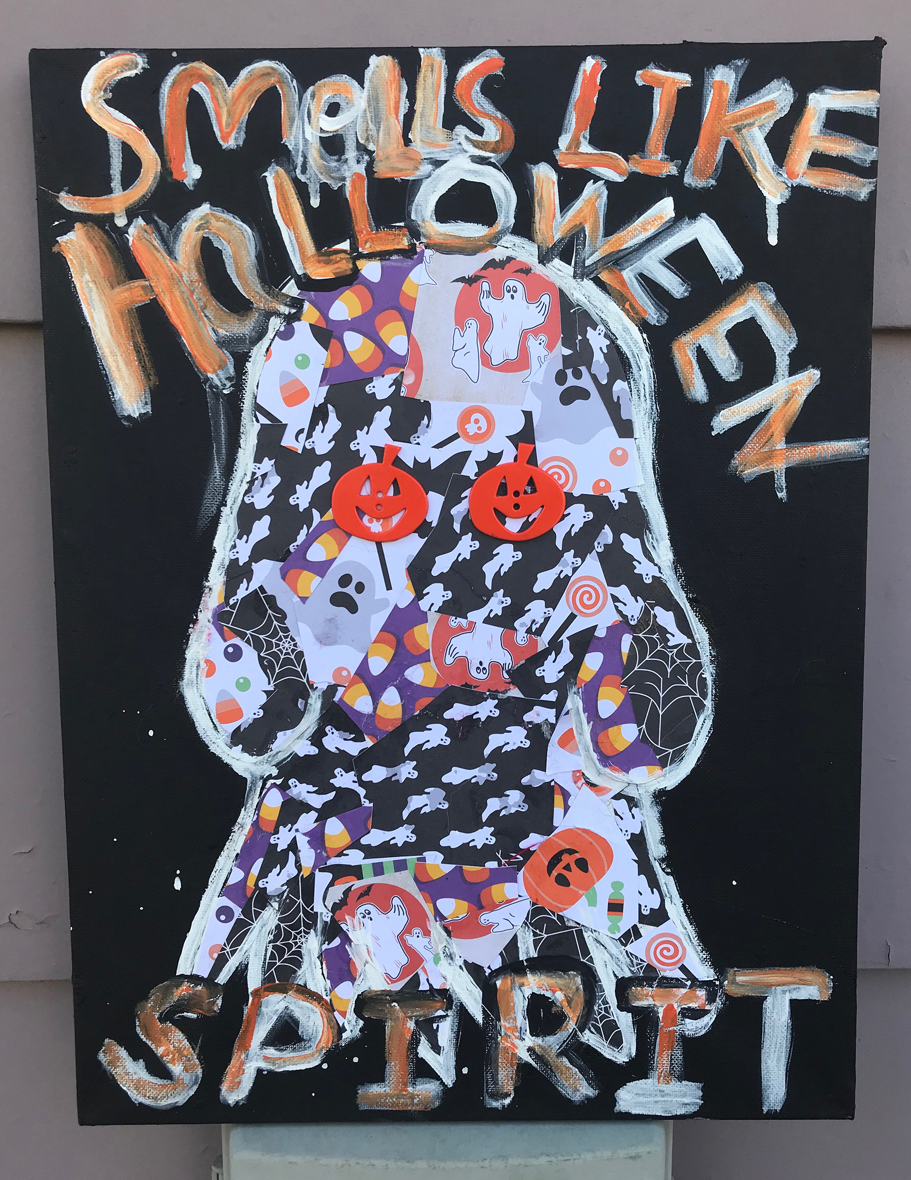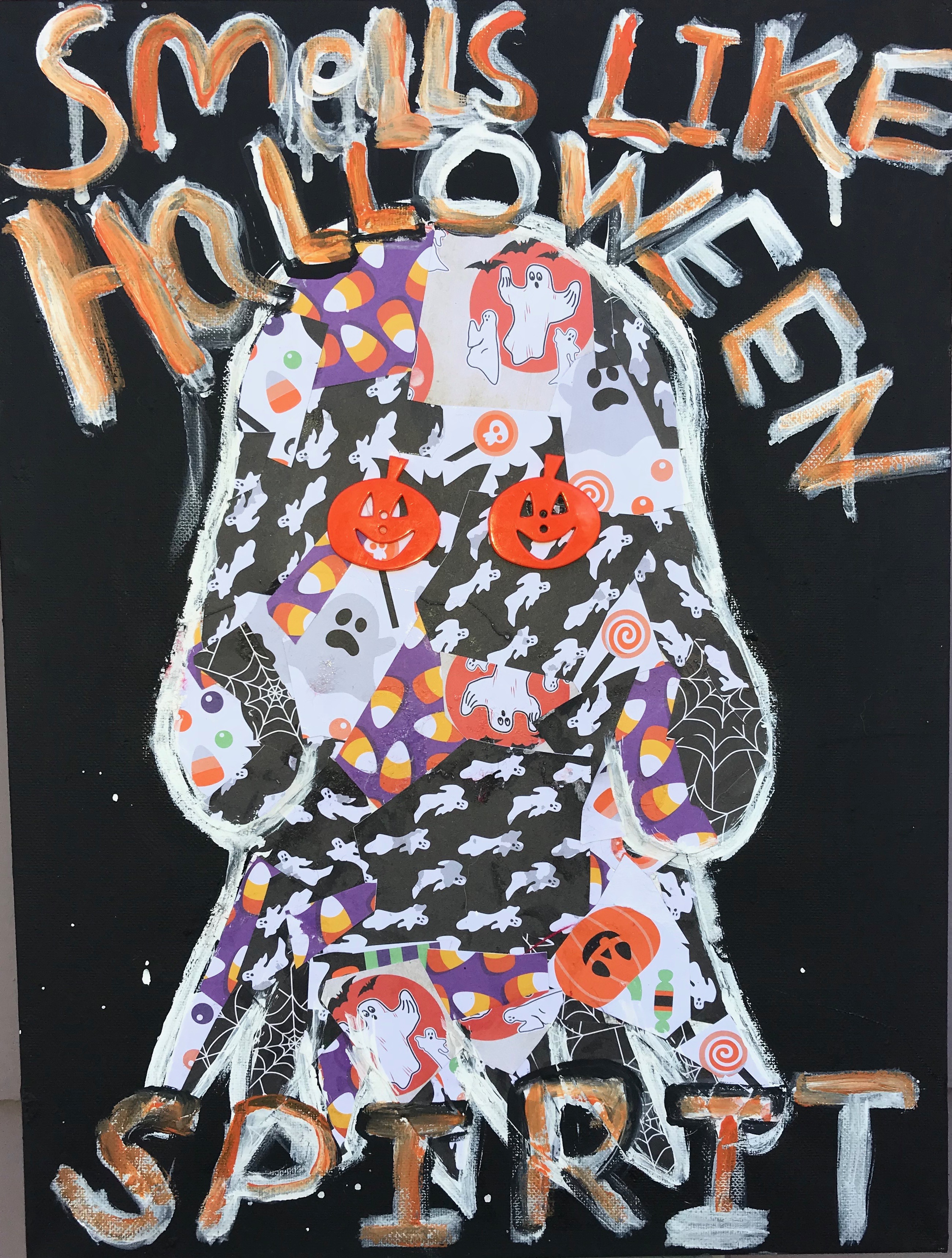Grunge ghosty has Halloween spirit year round! A parody of "Smells Like Teen (Halloween) Spirit", a stupid inside joke between a friend and I. Also meant to play off the Halloween popup chain stores "Halloween Spirit"...and he is a....spirit afterall. Get it? So many sides to the joke.