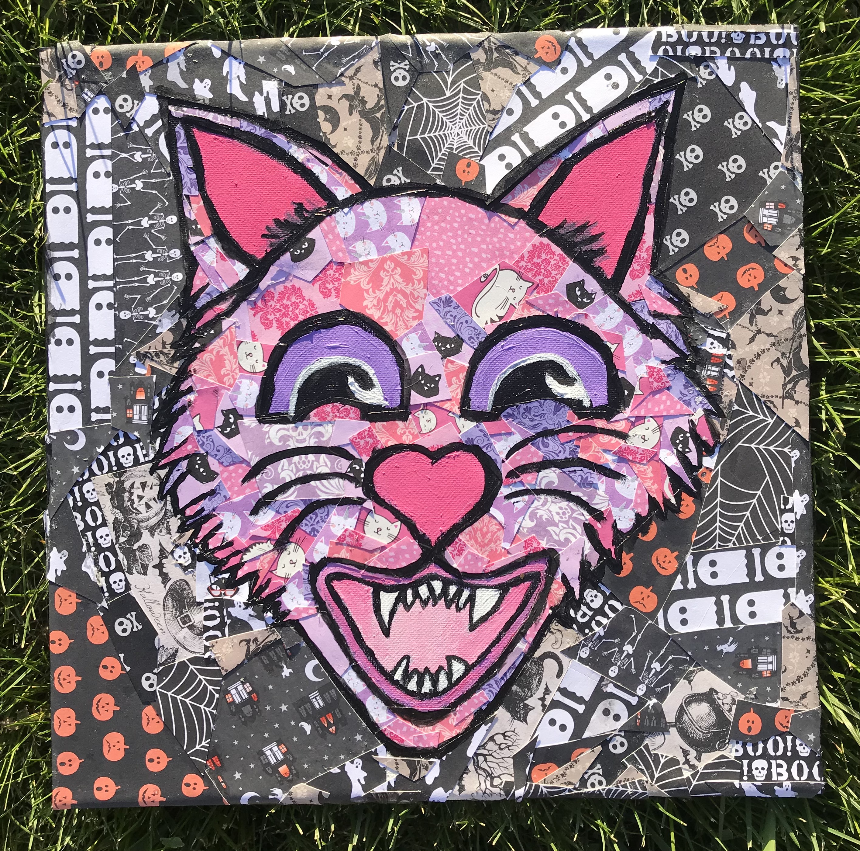 Inspired by the vintage Halloween decor of the last few years I wanted to make another hissing black cat all-over collage-style painting but with a more pastel goth aesthetic because I simply don't love the color orange.