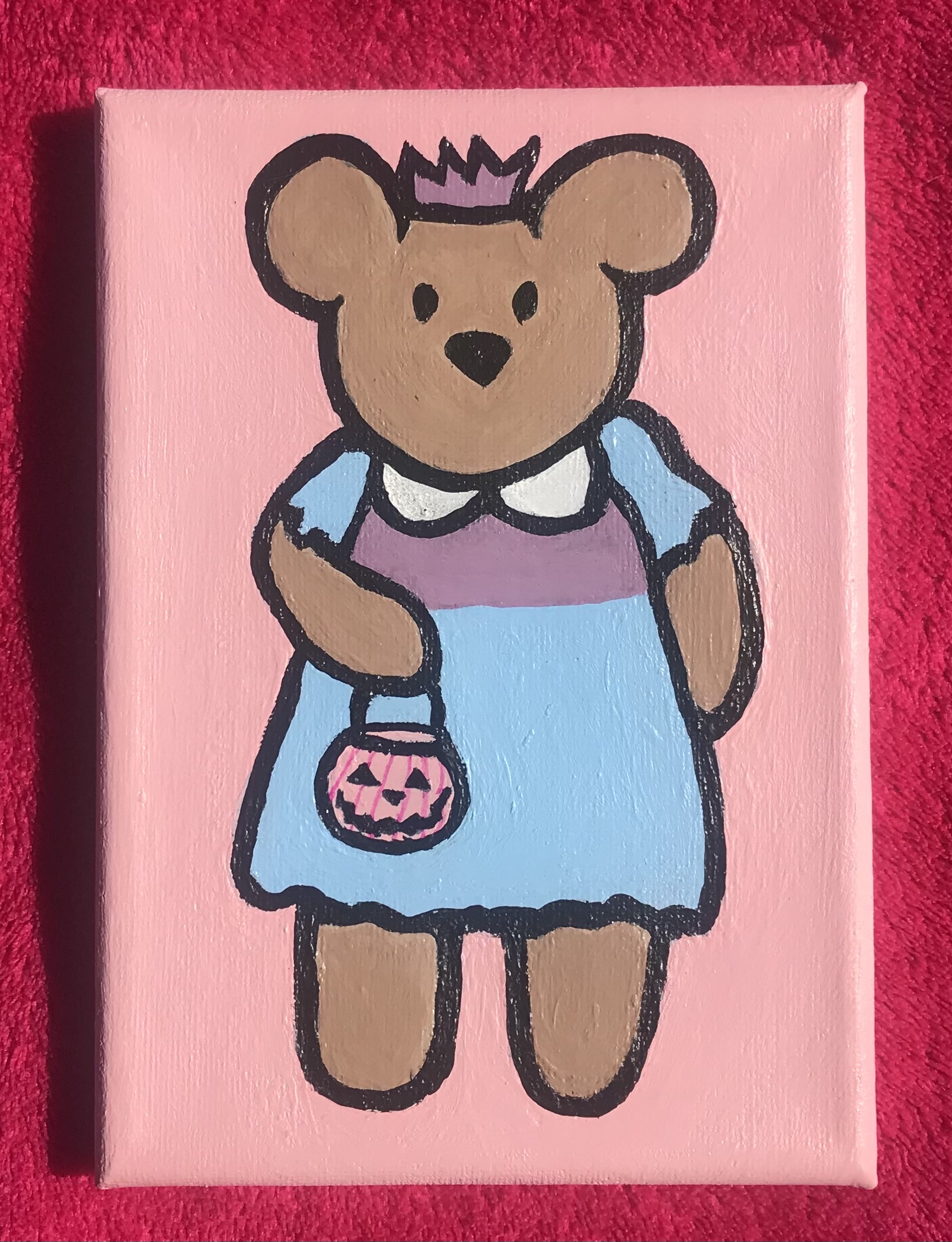 This teddy is all ready for trick or treating in her princess costume and her pumpkin trick or treat bucket! Mixing the spooky with the cute as always.