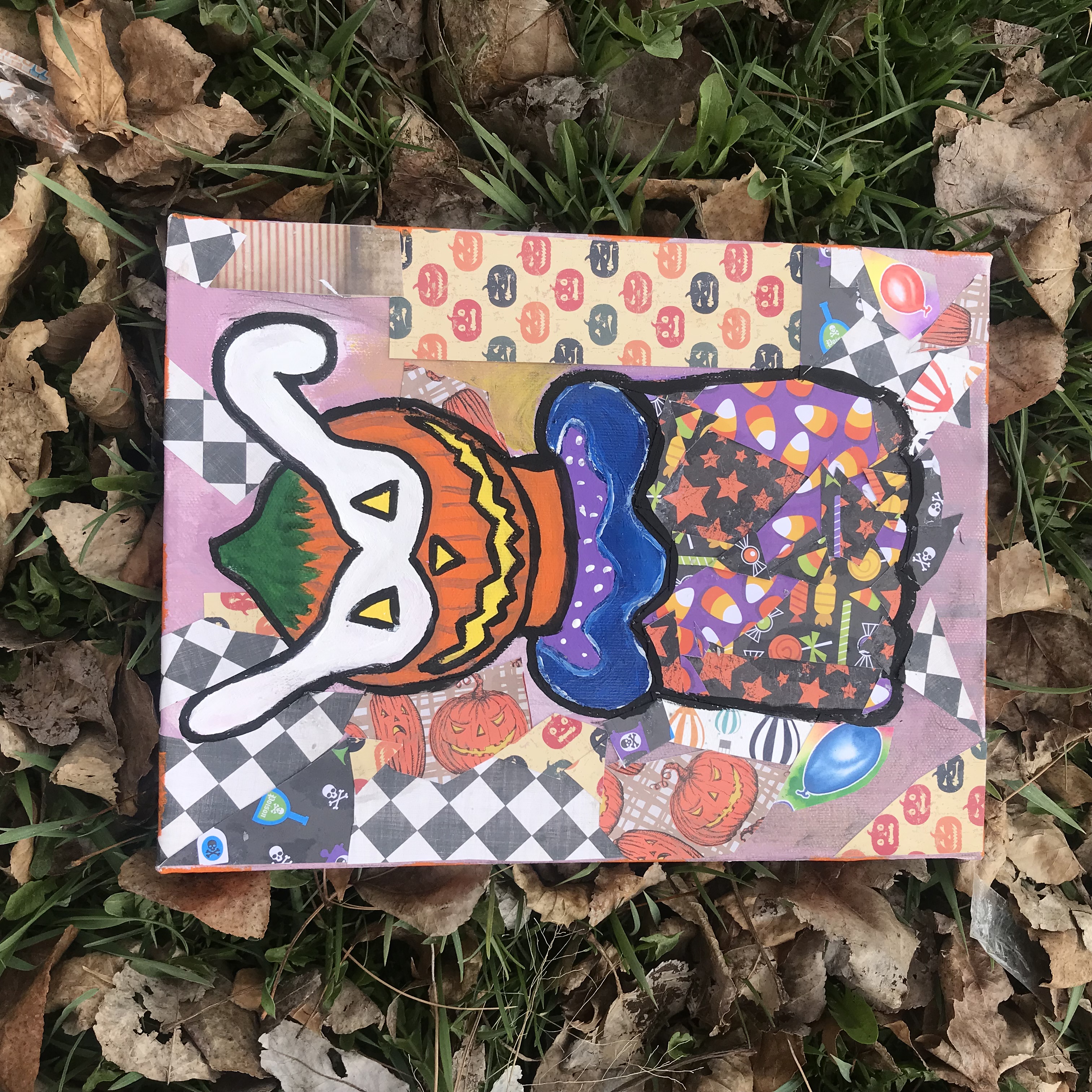 Made with acrylic paint and scrapbook paper and sealed with finish spray.