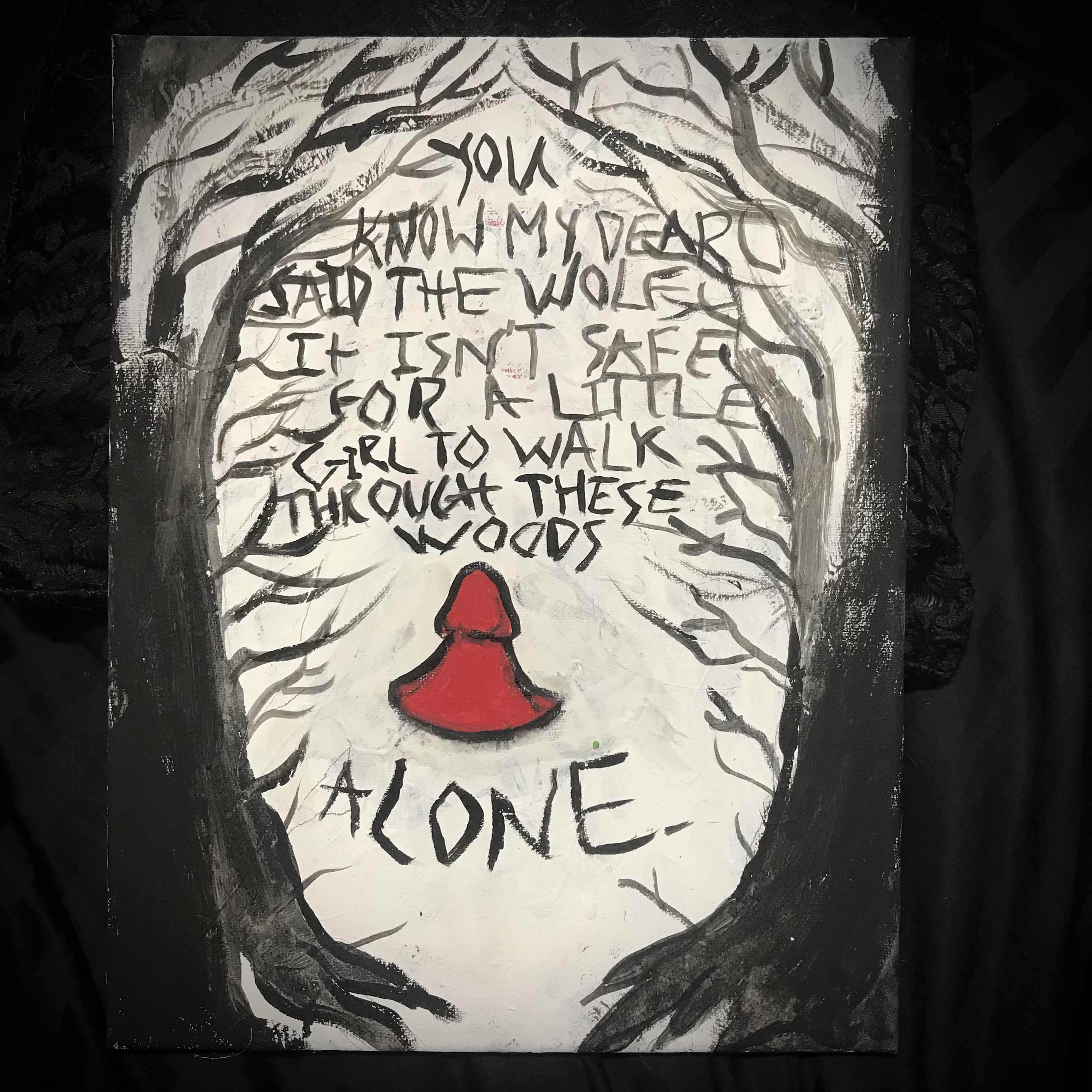 I initially wanted to capture the idea that Little Red Riding Hood is going into the woods alone, enveloped by trees, knowing the wolf would be awaiting her deep in the woods. So in 2022 I painted it over in white, leaving Little Red alone, re-did the illusion of being surrounded by trees, and added a quote from Politically Correct Fairytales. It works so much better now.