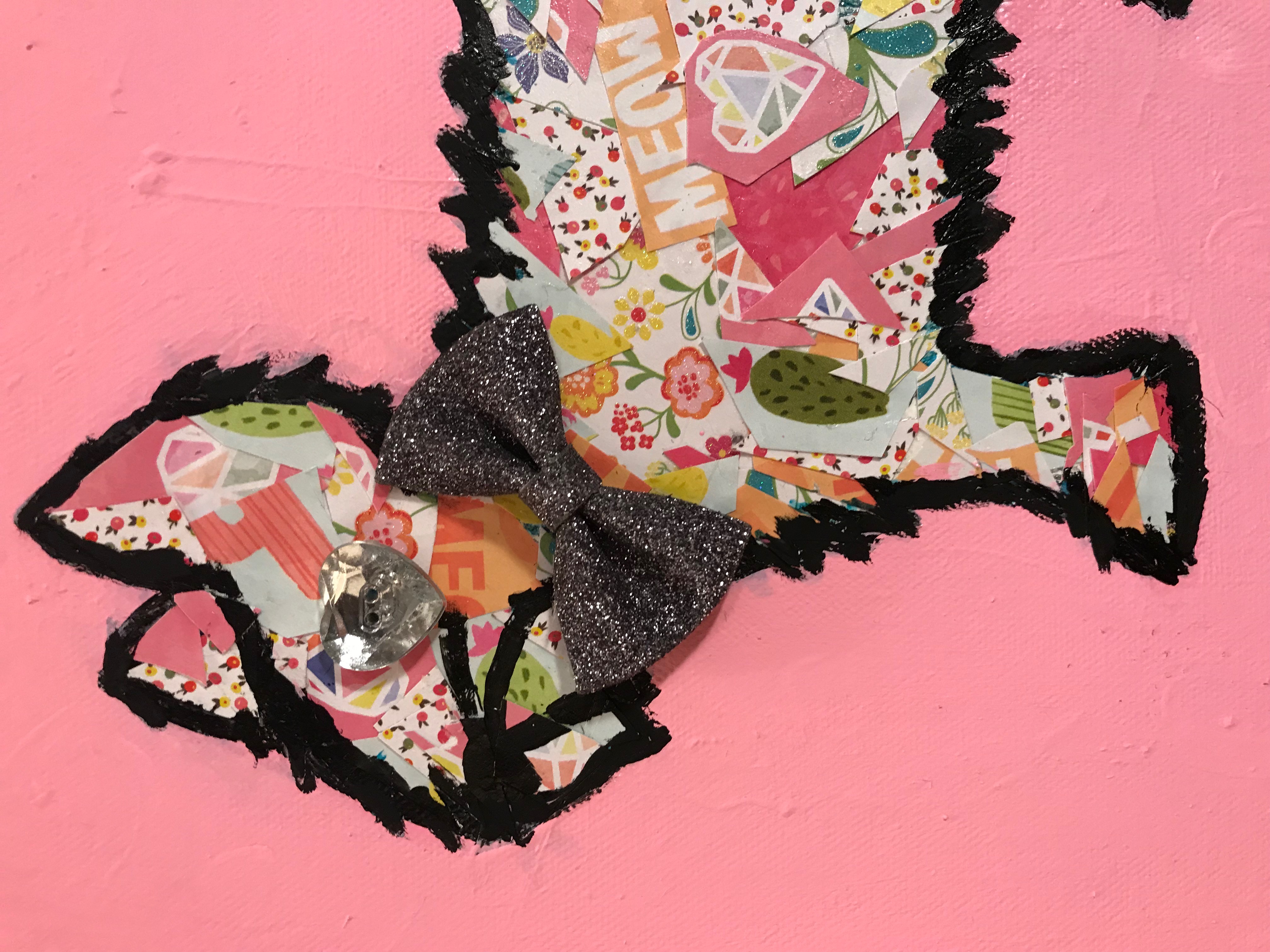 This floofy kitten is pretty in pink with her glittery, silver bowtie (a hairbow from my former emo days), a rhinestone heart-shaped button eye. She is perfect for a little girls' room!