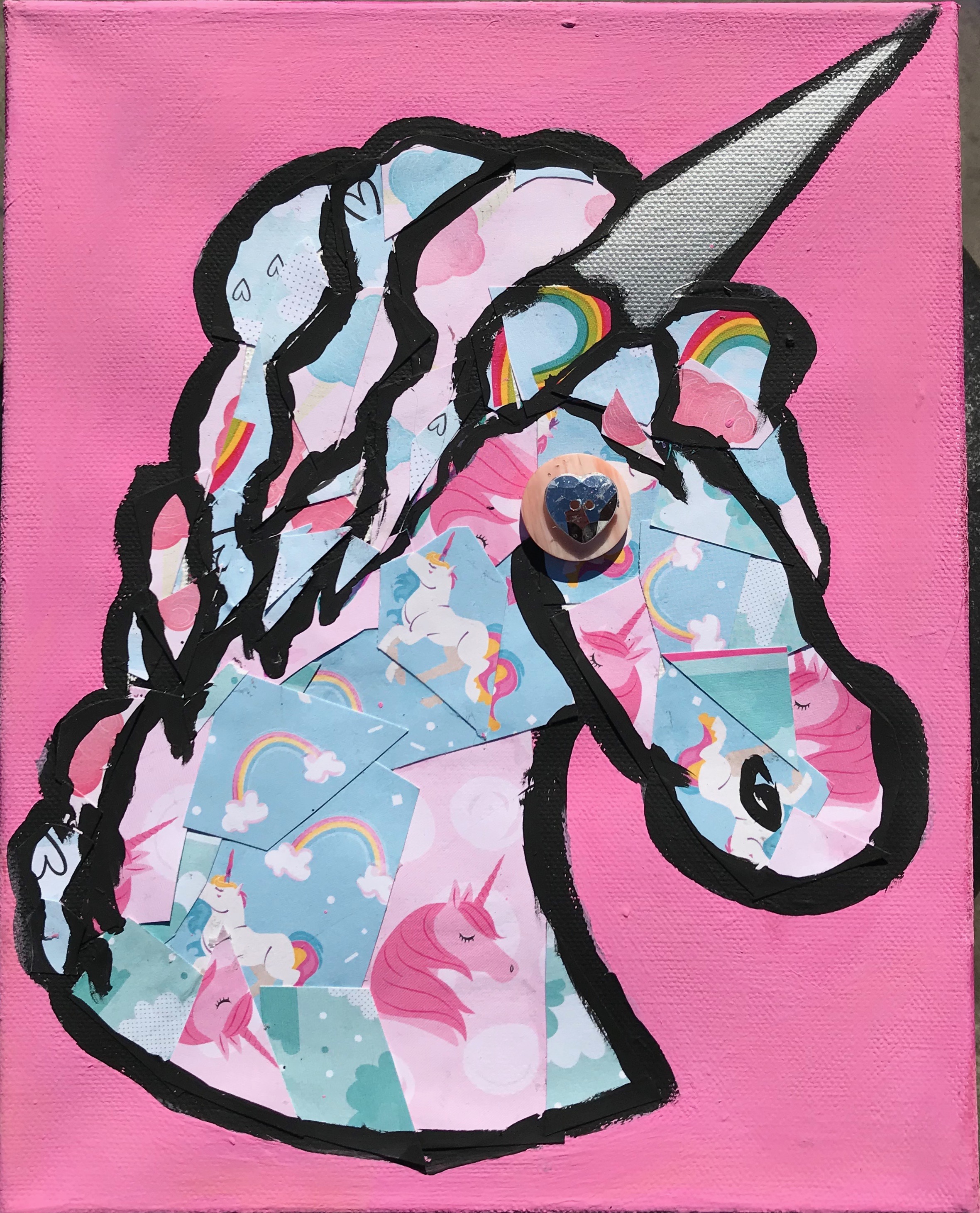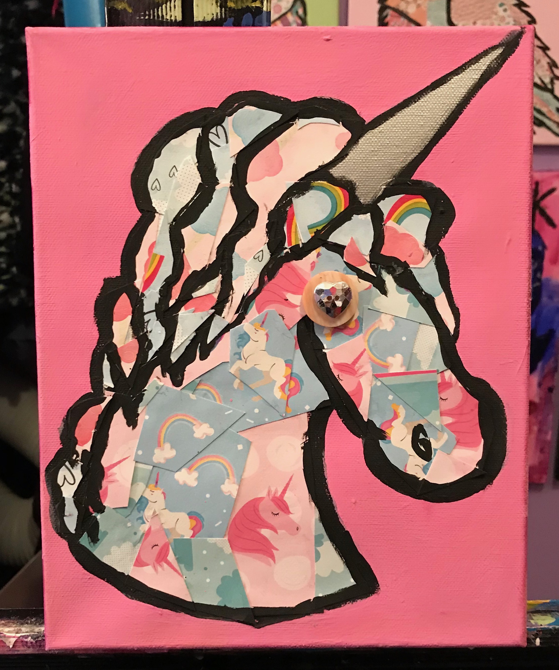 Mini unicorn, is short but stout. She is 8 x 10 with a 2 and 1/2 inch thickness! The sides are painted with alternating pink stripes. And she is covered in pink unicorn and rainbow paper, and has a pale pink button eye and a rhinestone heart-shaped button to complete the whole look. The perfect addition to any girl's bedroom!