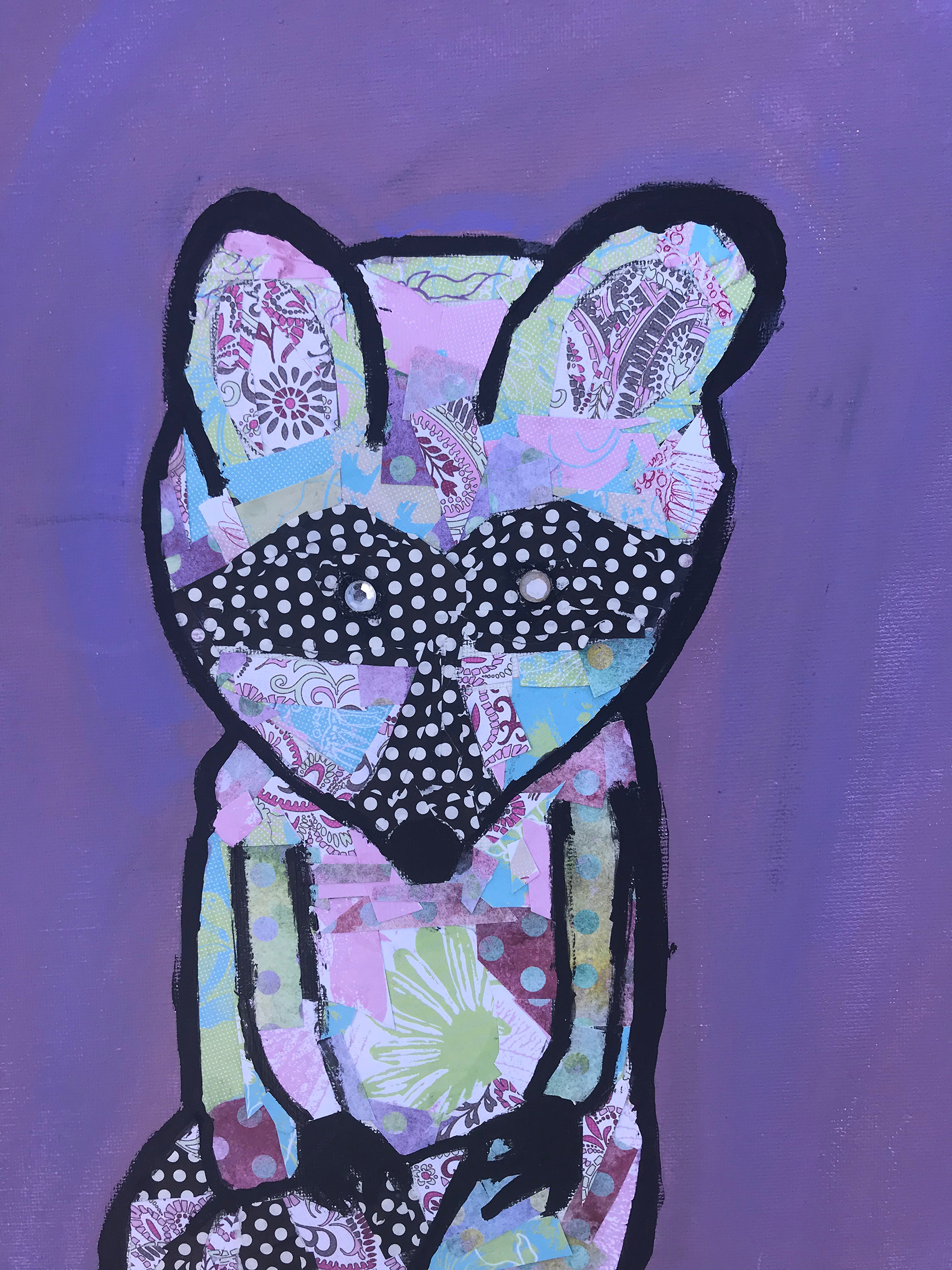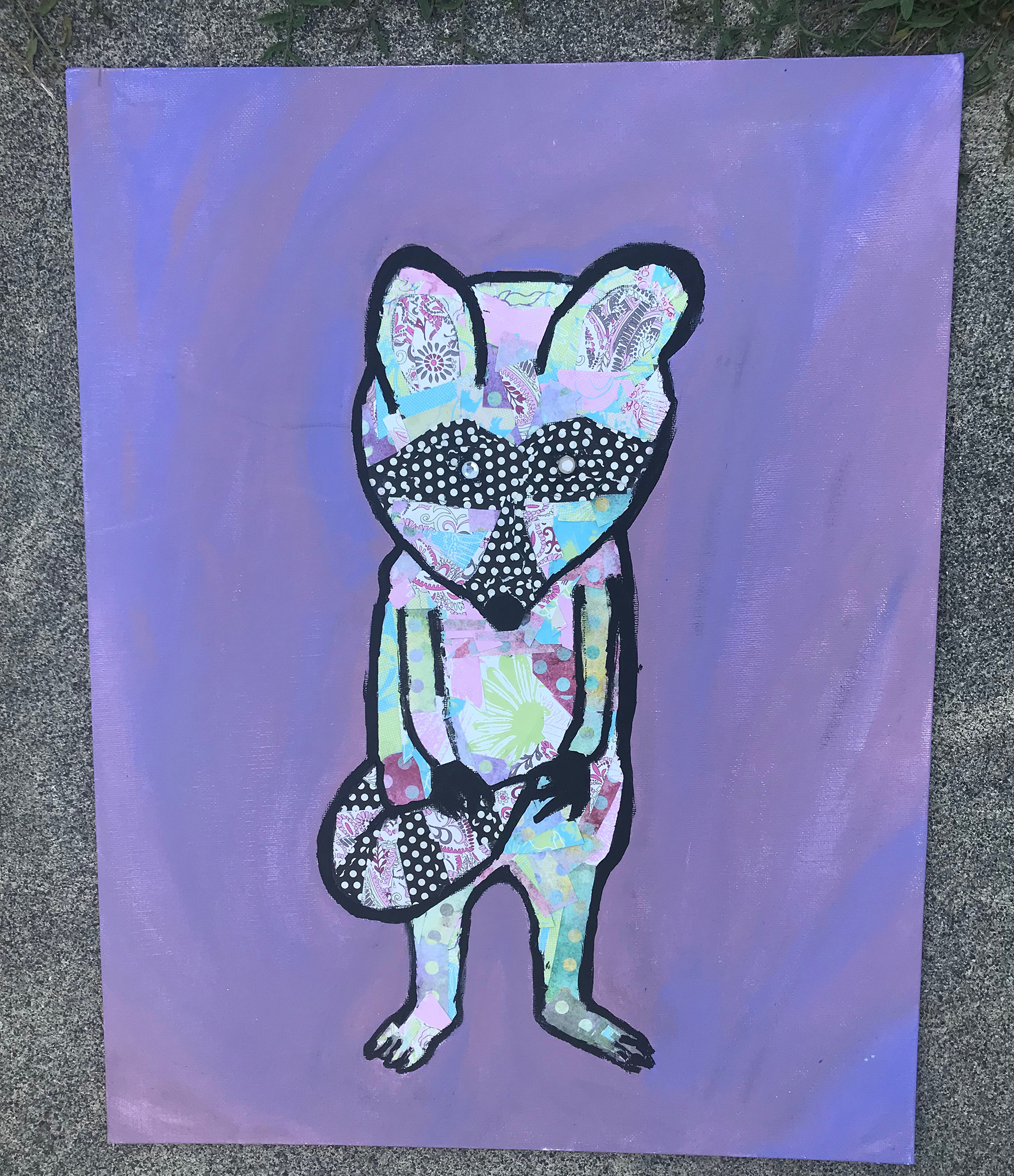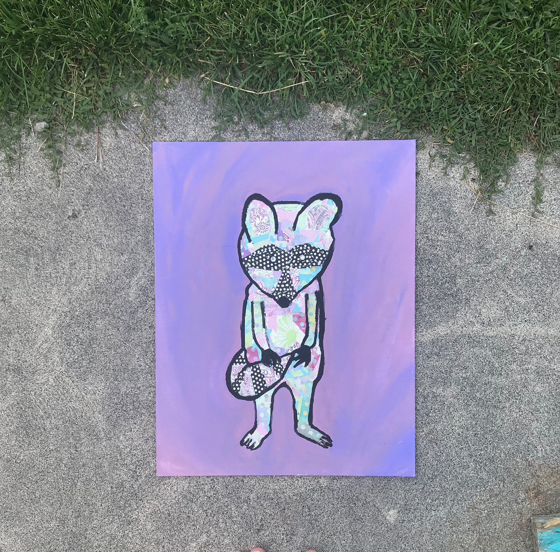 This purple paper raccoon painting is part of a 3-piece commissioned set of paintings that the client never picked up or paid for.