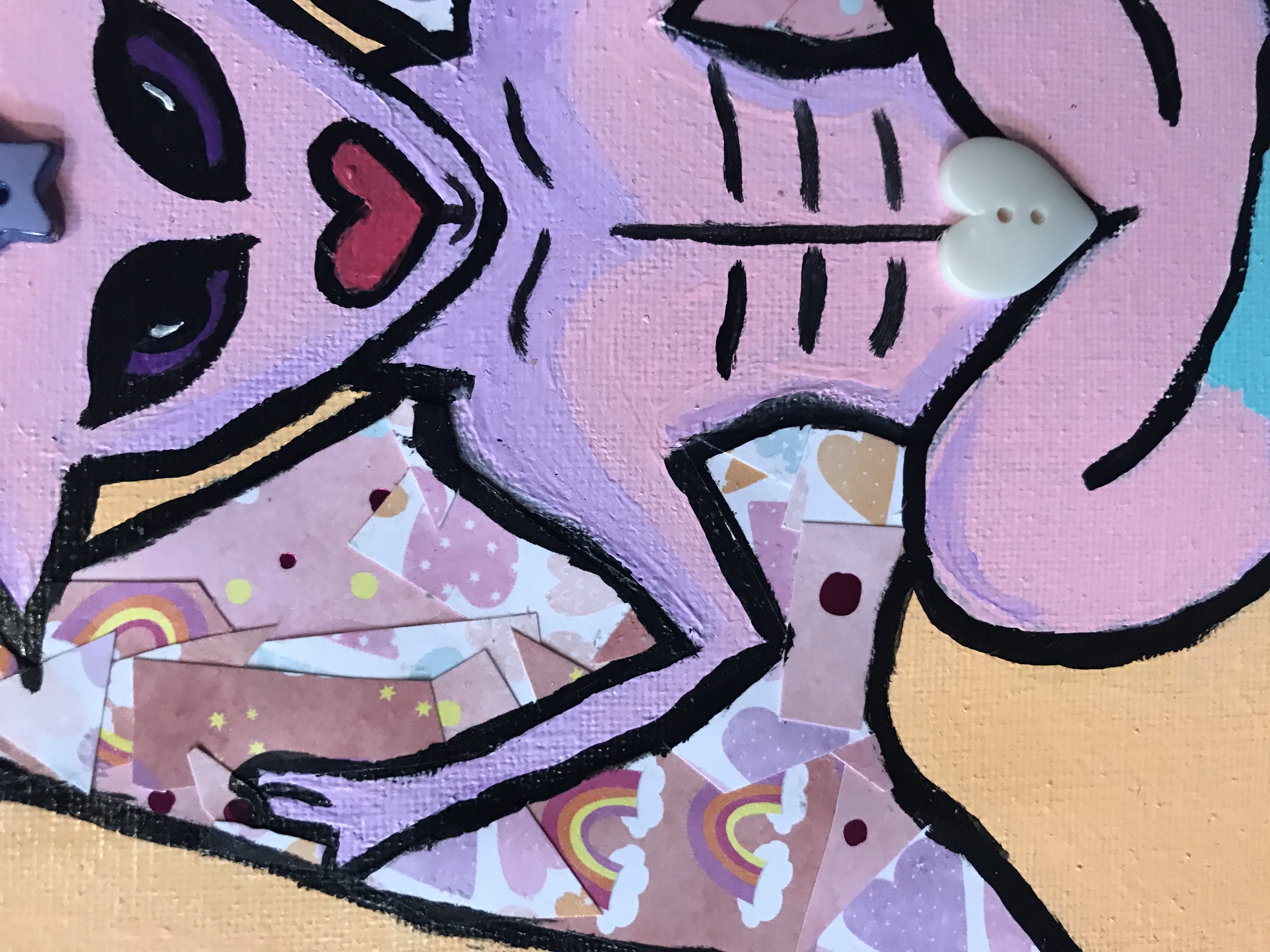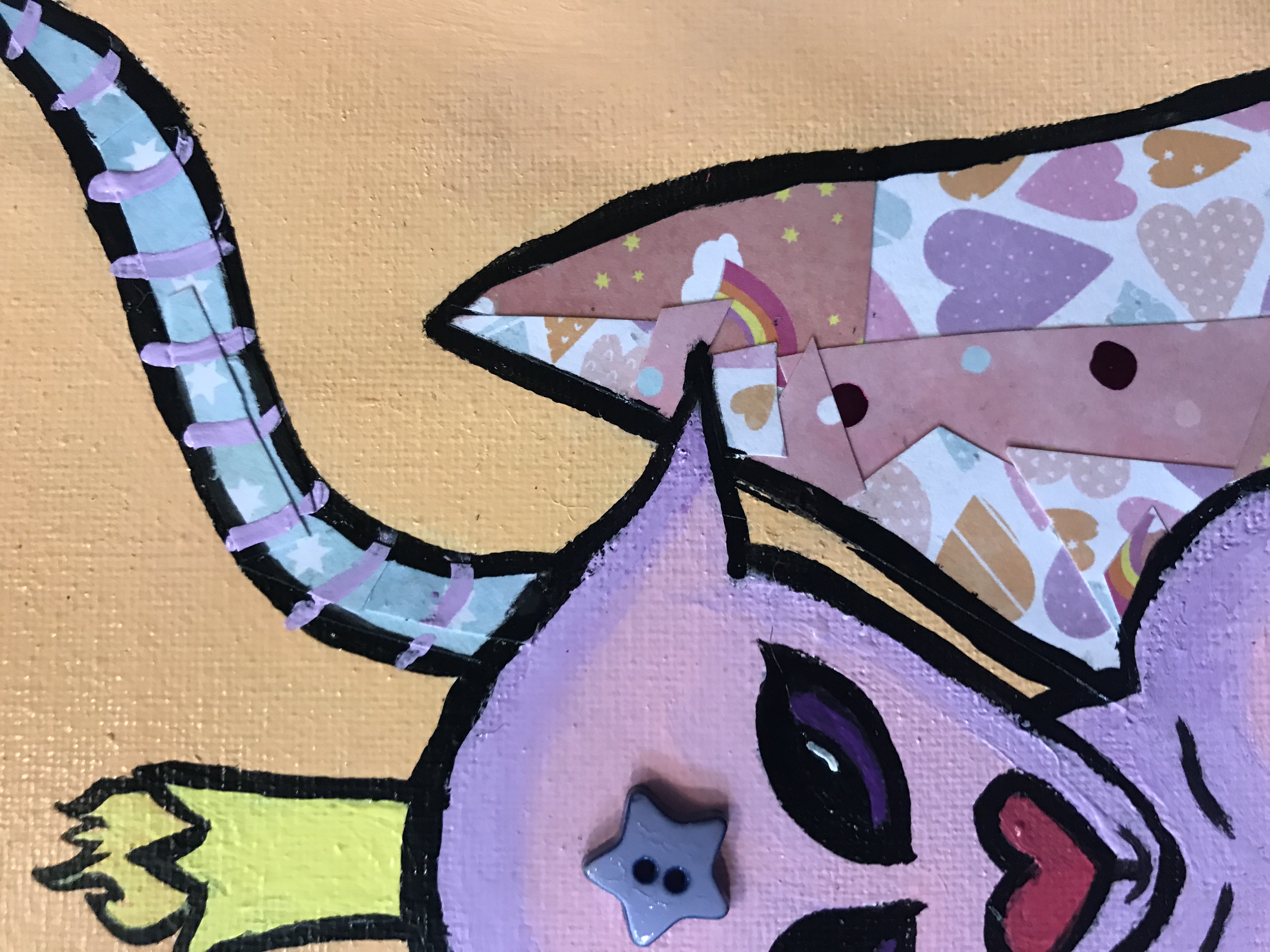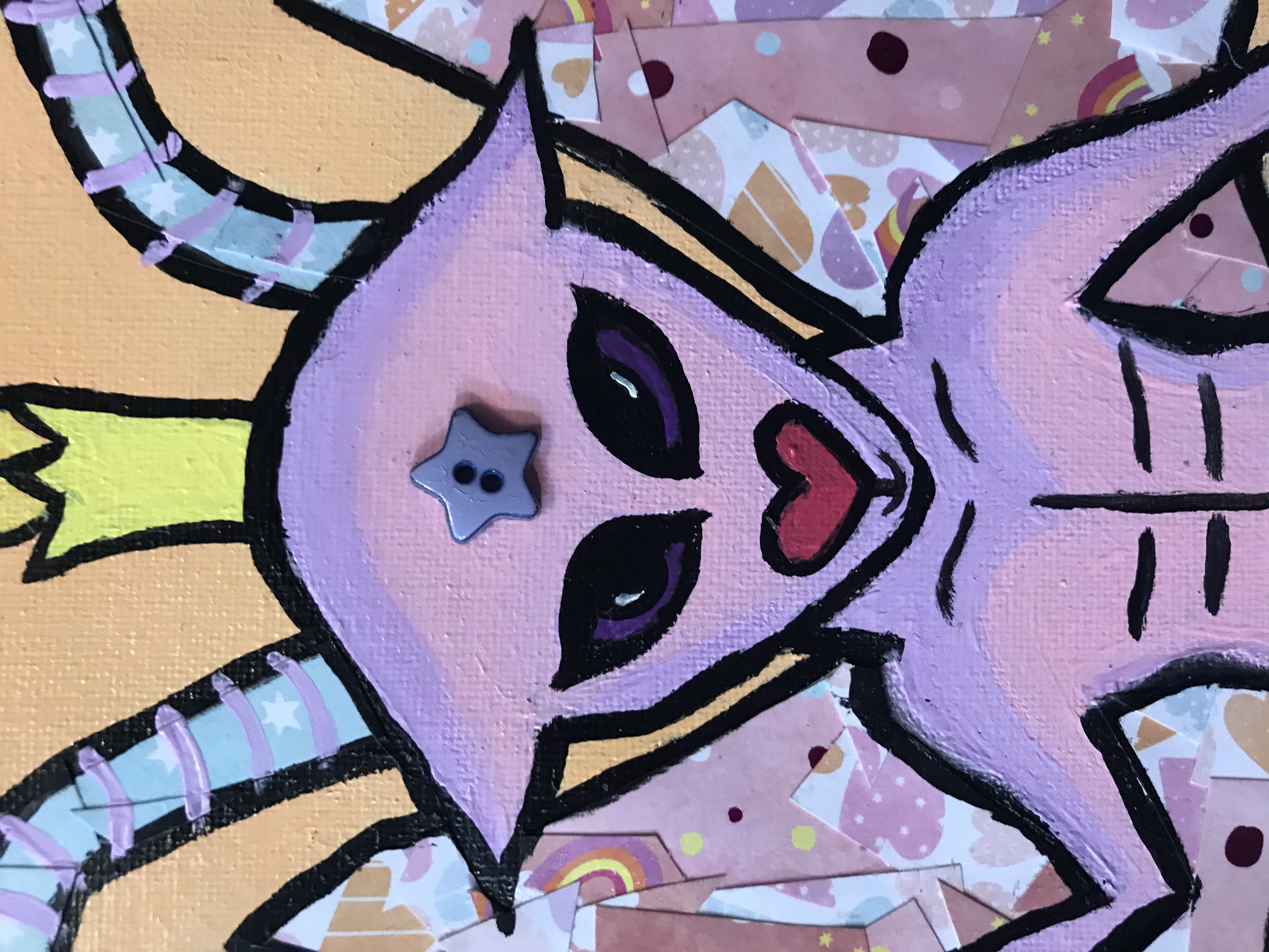 I researched the symbolisms of this figure and came to understand what they mean. While this is obviously not an accurate depiction of Baphomet I felt that by painting s/he pastel, it creates that balance that the figure represents. Baphomet is the balance in society the good/bad, day/night, male/female and the cutesy, Kawaii aesthetic masks an icon or image, most people wrongly consider to be "evil".