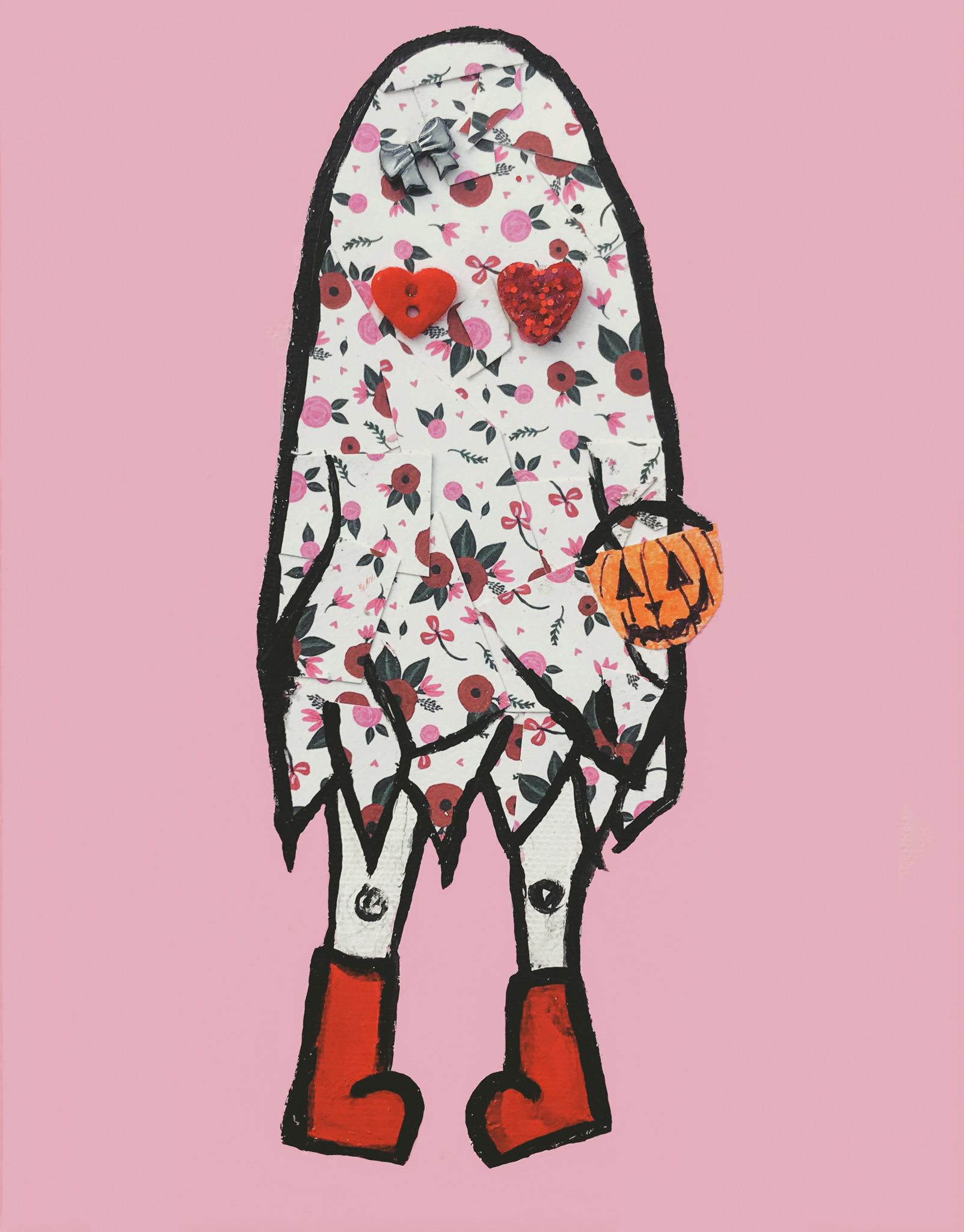 Lucinda Love Ghost! I named her after my favorite font lol. She has also had a cool 70s vibe going on with her floral bed sheet ghost costume, her read heart-shaped eyes (buttons), and her red rainboots. Her little trick-or-treat pail (paper) is filled to the brim with goodies after trick or treating all night!