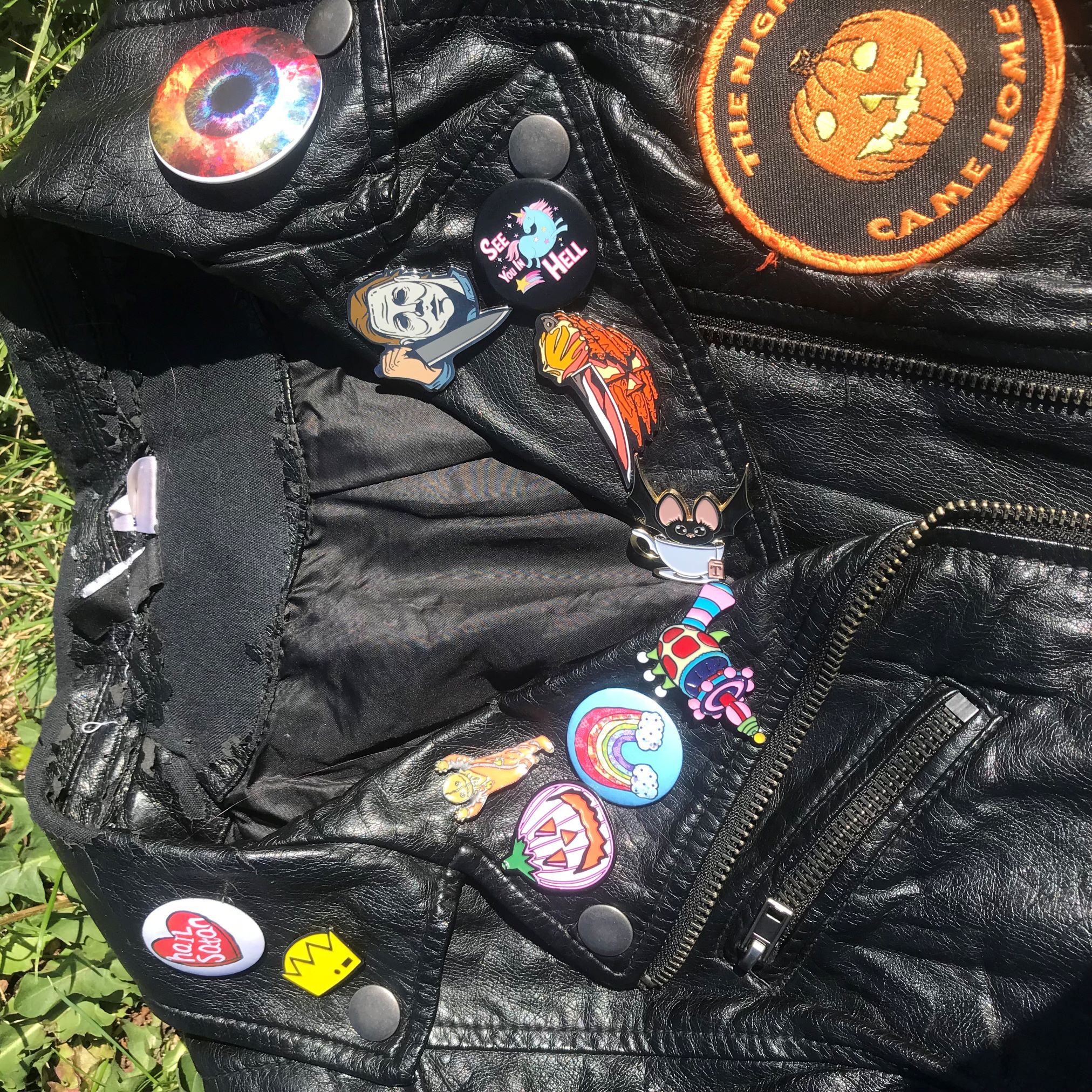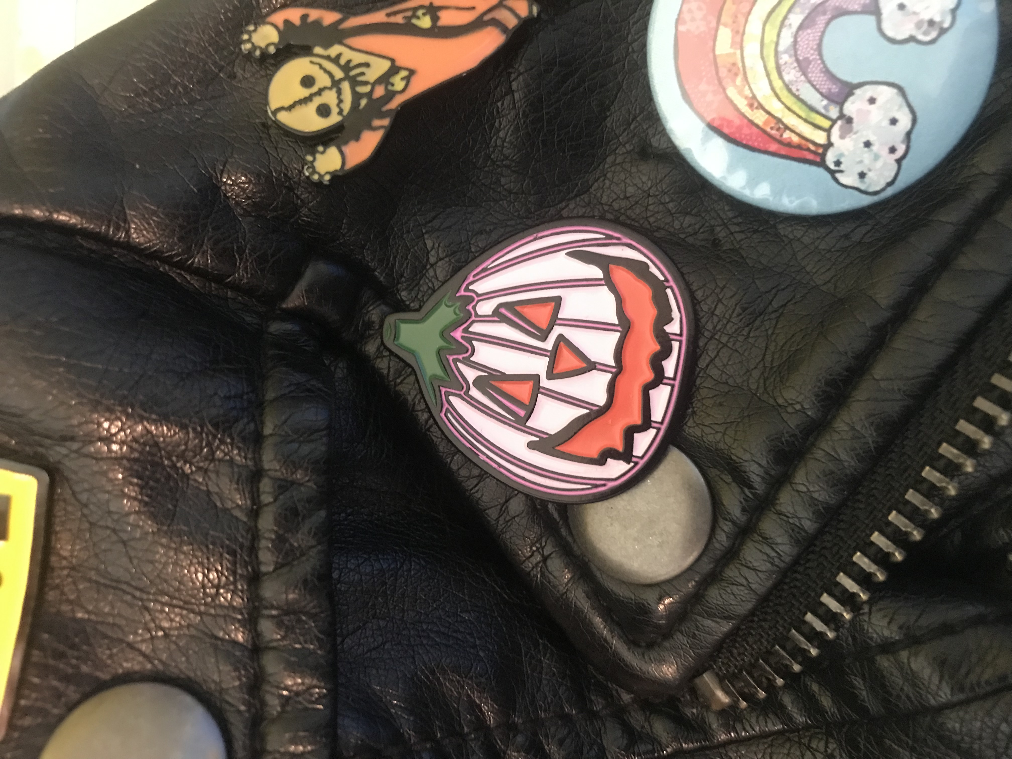 Measuring 1.25 inches Has a rubber stopper to keep it in place so you can wear it on your leather jacket or DIY vest!