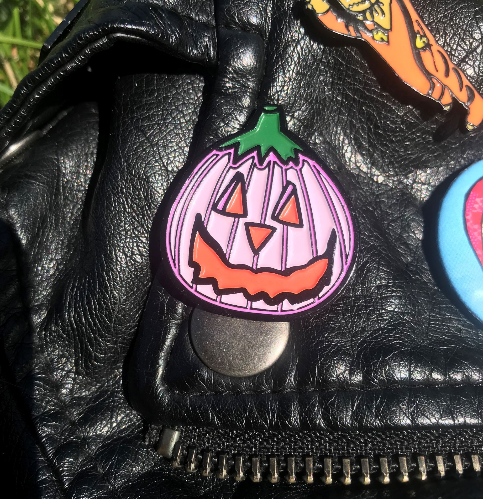 My iconic, spooky cute pastel pink Jack o lantern logo as a soft enamel PVC pin.