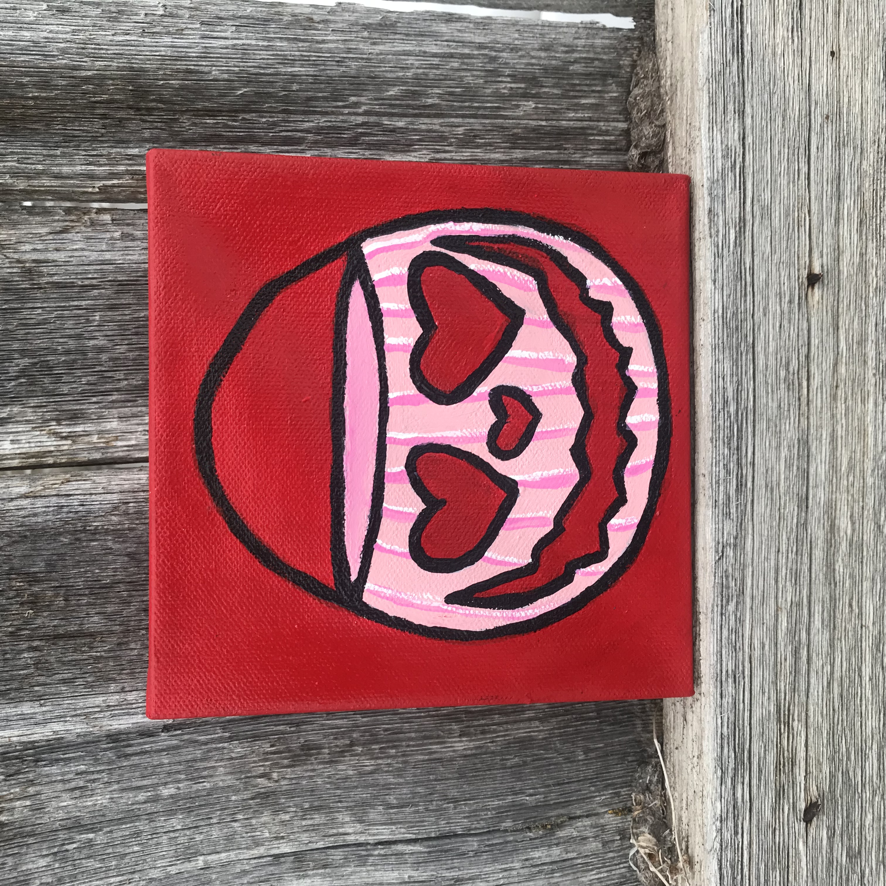 4 x 4 canvases (thicc) except the red one is thinner. You could frame, but they look nice as they are. Painted on all four sides.